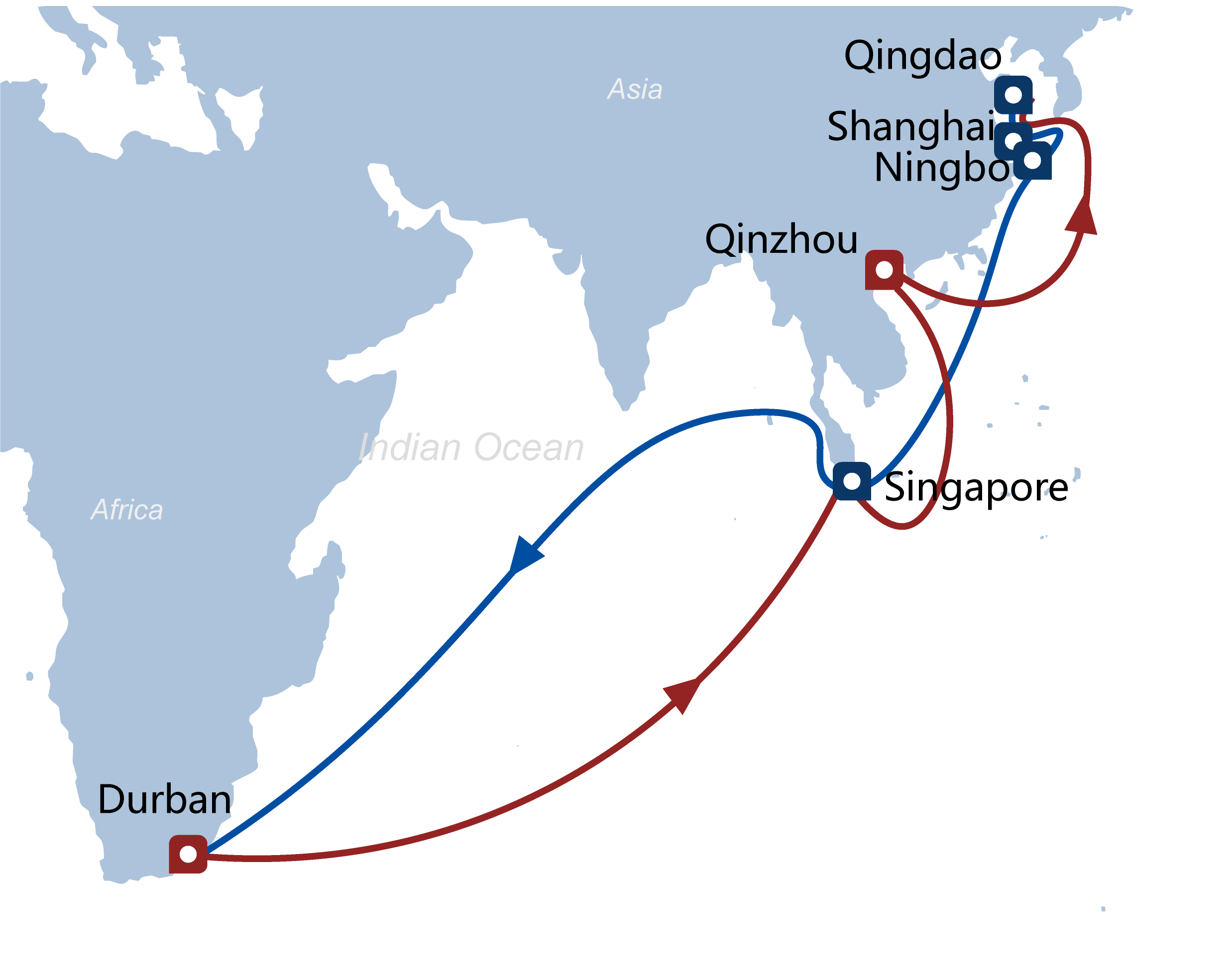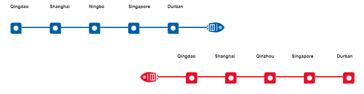 德班>>新加坡>>欽州>>上海>>青島