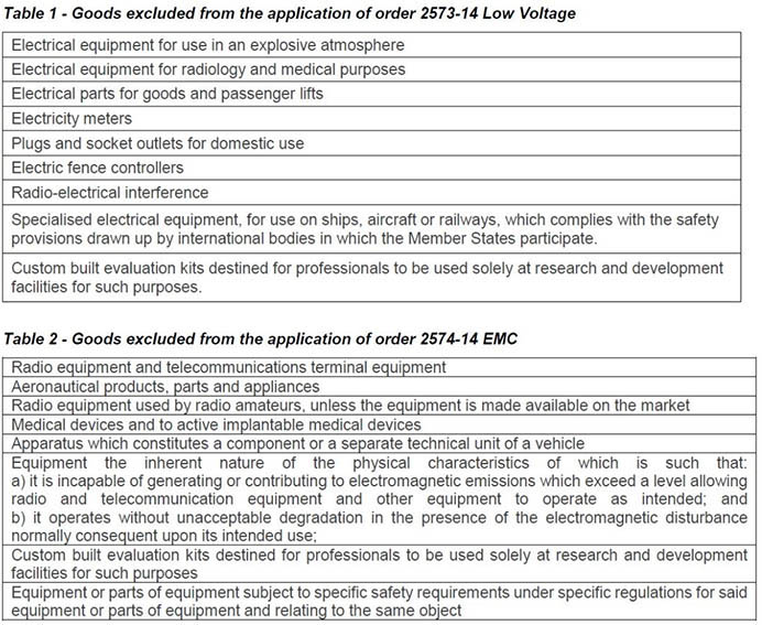 第2574-14號法令:關于電磁兼容產品的安全。該法令適用于成品電器或成品電器組合,面向終端用戶,容易產生特定級別的電磁干擾或性能易受到此類干擾影響的產品。